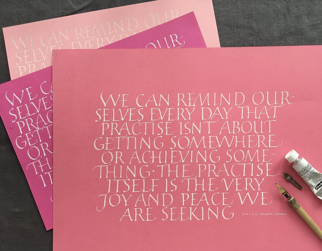 Layout paper is the calligrapher’s rough paper, which is useful for exercises, first drafts and for roughing out ideas. It is thinner than cartridge paper and therefore more cost effective however, you will notice the paper cockles when the wet ink dries, but it is only practice paper. Don’t be tempted to use photocopying paper, because the ink will bleed.