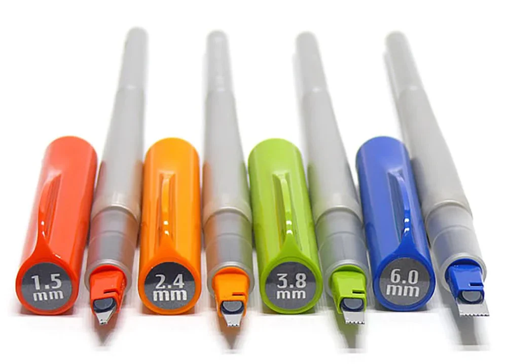 These nibs also come in a range of sizes and are an alternative to Mitchell nibs; you don’t need to purchase both. The main difference is these nibs have an integrated reservoir but you will still need to purchase a nib holder.